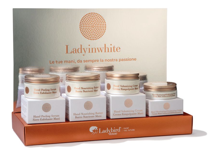 • Ladyinwhite Hand Care è una linea di trattamenti mani Made in Italy con ingredienti di origine naturale, adatta a tutti i tipi di pelle. Formule mirate rispondono alle esigenze più comuni: rughe, macchie, luminosità, sensibilità e impurità. La gamma comprende Crema Illuminante, Crema Rimpolpante, Burro Nutriente e Siero Esfoliante, presentati in un espositore compatto da banco con prodotti rivendita e tester dedicati.