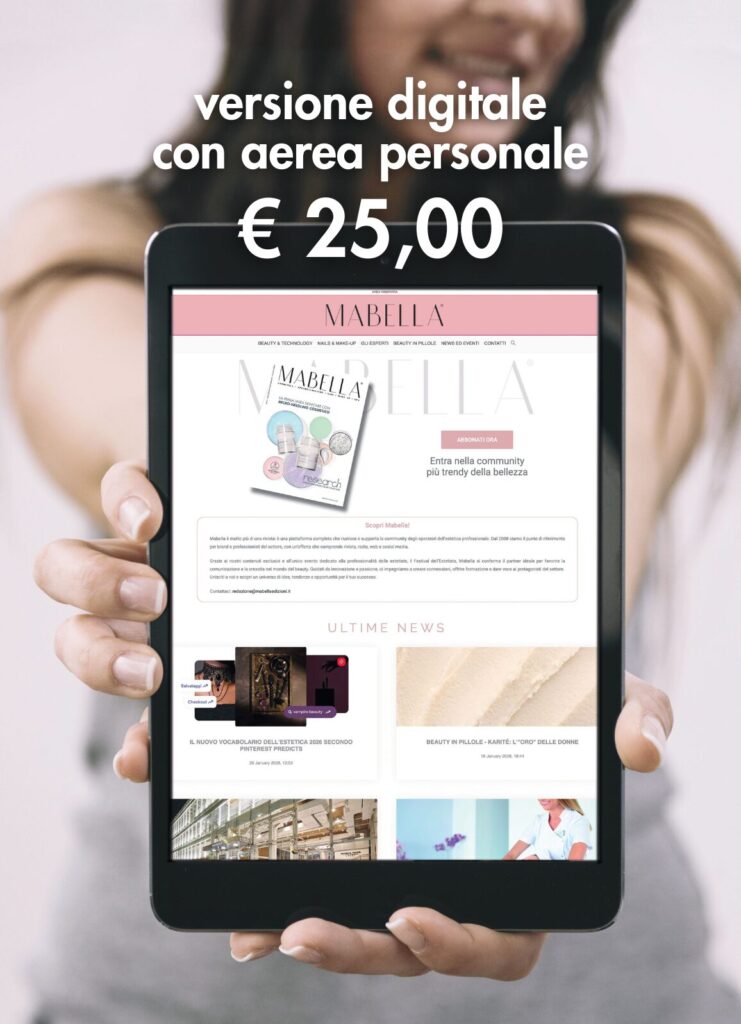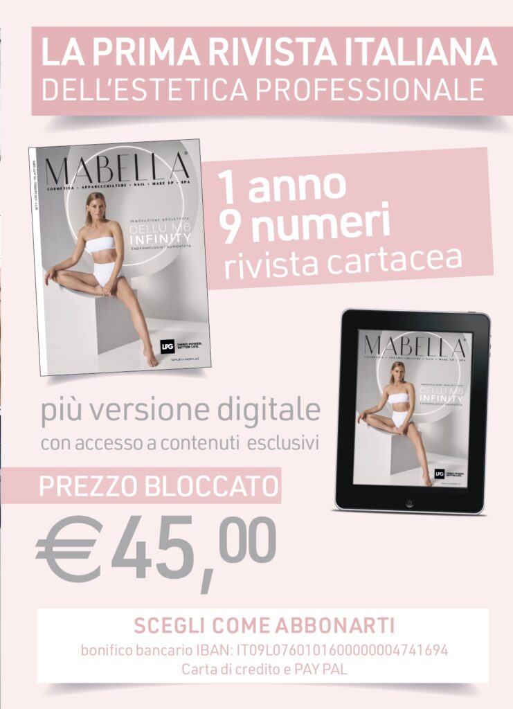 SCEGLI IL TUO PIANO DI ABBONAMENTO Mabella accompagna il lavoro quotidiano, offrendo contenuti pensatiper informare, formare e orientare le professioniste dell’estetica. CARTACEO + DIGITALE TUTTO DIGITALE ABBONATI AL CARTACEO + DIGITALE Abbonamento Mabella Cartaceo 45€ Nome * Cognome * Nome centro estetico * Indirizzo * Cap * Città * Provincia * AGALANAOAPAQARATAVBABGBIBLBNBOBRBSBTBZCACBCECHCICLCNCOCRCSCTCZENFCFEFGFIFMFRGEGOGRIMISKRLCLELILOLTLUMBMCMEMIMNMOMSMTNANONUOGOROTPAPCPDPEPGPIPNPOPRPTPUPVPZRARCRERGRIRNRORomaSASISOSPSRSSSVTATETNTOTPTRTSTVUDVAVBVCVEVIVRVSVTVV Codice fiscale * Partita iva Metodo di pagamento * Bonifico bancario Carta di credito - PayPal Telefono * Email * Password * Hai un Codice? Acconsento al trattamento dei miei dati personali come specificato nelle Privacy Policy. ABBONATI AL DIGITALE Abbonamento Mabella Digitale 25€ Nome * Cognome * Nome centro estetico * Indirizzo * Cap * Città * Provincia * AGALANAOAPAQARATAVBABGBIBLBNBOBRBSBTBZCACBCECHCICLCNCOCRCSCTCZENFCFEFGFIFMFRGEGOGRIMISKRLCLELILOLTLUMBMCMEMIMNMOMSMTNANONUOGOROTPAPCPDPEPGPIPNPOPRPTPUPVPZRARCRERGRIRNRORomaSASISOSPSRSSSVTATETNTOTPTRTSTVUDVAVBVCVEVIVRVSVTVV Codice fiscale * Partita iva Codice SDI * Metodo di pagamento * Bonifico bancario Carta di credito - PayPal Telefono * Email * Password * Hai un Codice? Acconsento al trattamento dei miei dati personali come specificato nelle Privacy Policy.
