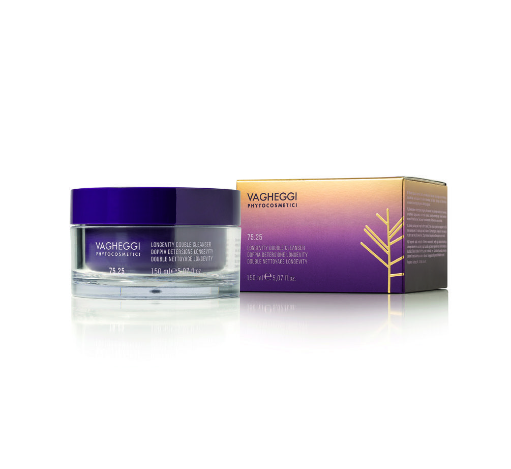 Longevity Double Cleanser Vagheggi Phytocosmetici è l’innovativo trattamento a doppia detersione, ricca di estratto di Lapacho, attivatore di giovinezza, e burri nutrienti. Prevede una prima fase di detersione con la cream-to-oil, la crema si trasforma in olio detergente e struccante per rimuovere impurità e make-up. Si prosegue con la seconda fase, applicando il gel a base di gluconomannano, che completa la pulizia con azione enzimatica ad effetto levigante e illuminante. Infine, sciacquare per una cute detersa, morbida e idratata.
