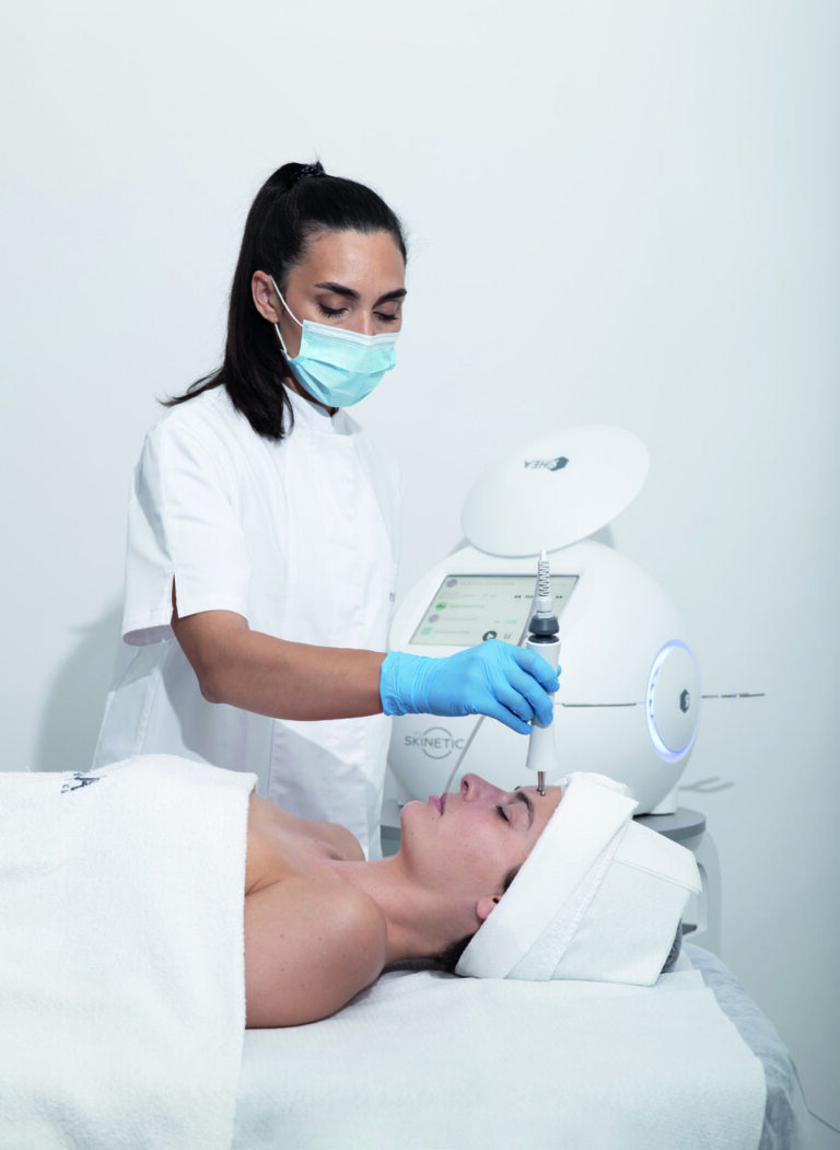 G.A.: I 5 protocolli Research sono eseguibili in due modalità distinte, manuale e tecnologico (con l’ausilio di mySKINETIC, la nostra tecnologia di elettrostimolazione metabolica), per adattarsi ai diversi bisogni di personalizzazione del trattamento. La versione manuale è studiata per valorizzare il tocco professionale dell’estetista: ogni manovra ha una finalità biofunzionale — stimolare la microcircolazione, migliorare la permeabilità cutanea, guidare la veicolazione degli attivi. Con mySKINETIC, invece, entriamo in una dimensione tecnologica più profonda: correnti a basso impatto attivano i recettori cellulari e aumentano la penetrazione transdermica degli attivi.