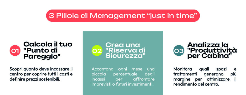 - calcola il tuo “punto di pareggio” (Break Even Point): non limitarti a sommare le bollette. Calcola quanto deve incassare il tuo centro per coprire costi fissi, stipendi, prodotti e tasse. Solo così potrai dare un prezzo corretto ai tuoi trattamenti;