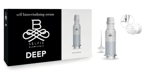 B-SELFIE Deep è un biorivitalizzante intraepidermico fai-da-te dall’effetto immediato che, grazie a un’innovativa siringa predosata e con microaghi da 0,5 mm, veicola un siero rivitalizzante botox-like e filler-like, per un intenso e istantaneo effetto replumping e tensore, con un’idratazione profonda e duratura.