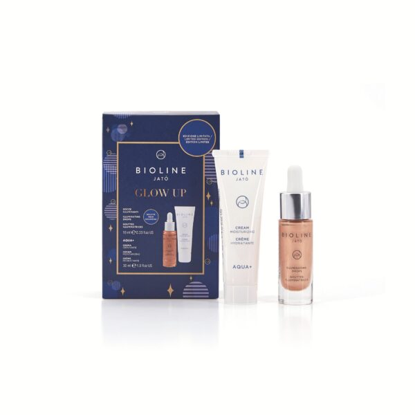 La Christmas Box Glow Up contiene la Crema Idratante Aqua+ e le speciali Gocce Illuminanti, un prodotto presente in esclusiva in questa box e non acquistabile separatamente. Le Gocce Illuminanti intensificano la luminosità del viso e ne valorizzano i lineamenti, donando alla pelle un colorito dai delicati riflessi bronze. La texture impalpabile e ultra-fluida si fonde con la pelle in assoluta leggerezza, donandole un look sofisticato ed elegante.  Si possono miscelare 1 o 2 gocce di prodotto alla crema viso abituale per un effetto luminoso globale su viso, collo e décolleté, oppure si possono applicare da sole con piccoli tocchi sulla pelle per esaltare i punti strategici del viso: zigomi, dorso del naso, mento e arco sopra la bocca. Le Gocce Illuminanti possono essere usate in abbinamento alla Crema Idratante Aqua+, una crema viso-collo potenziata e arricchita da un’innovativa sostanza biotecnologica, che apporta idratazione, freschezza e luminosità immediate alla pelle. Tutte queste caratteristiche rendono la Christmas Box Glow Up di Bioline Jatò un regalo ideale sotto le feste, per apparire ancora più scintillanti.
