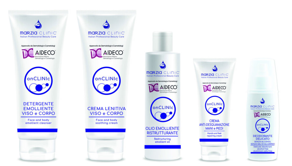 Le cinque referenze che compongono la linea onCLINIc sono la nuova crema lenitiva viso e corpo, il leggero olio emolliente e ristrutturante, il detergente emolliente viso e corpo, il deodorante delicato e la crema anti-desquamazione mani e piedi, ideale per combattere anche la particolare disidratazione di queste parti del corpo.