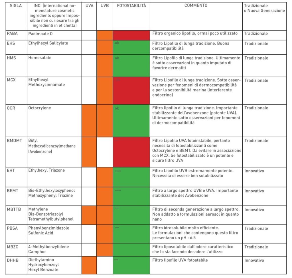 Tra i filtri a maggiore efficienza ce ne sono alcuni che necessitano di essere foto-stabilizzati mediante opportune combinazioni: un esempio è l’Avobenzone che deve sempre essere abbinato ad un suo stabilizzante. Quando in etichetta è presente l’ingrediente Butyl Methoxydibenzoylmethane (Avobenzone filtro UVA) è doveroso trovare almeno uno dei suoi foto-stabilizzatori quali Octocrylene e/o BEMT e/o Butyolctylsalicilate. Nel caso di questo filtro, è noto come invece l’abbinamento con Ethylhexyl Methoxycinnamate sfavorisca la sua foto-stabilità, risultando un abbinamento sconsigliato. Vi sono altri filtri UVA come il DHHB che sono fotostabili, ma l’Avobenzone, se stabilizzato, è un filtro UVA molto potente ed efficiente.