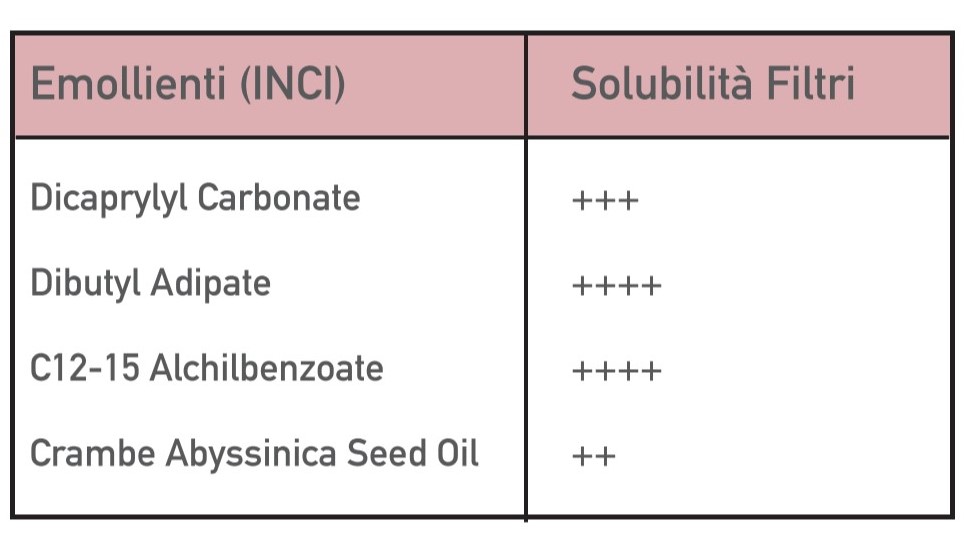 Essendo la maggior parte dei filtri chimici polveri liposolubili, la scelta degli emollienti influenza l’efficacia del prodotto, in quanto concorrono ad assicurare un’ottima dispersione dei filtri nel formulato. Ciò consente di evitare fenomeni di cristallizzazione che inficerebbero la protezione solare nel tempo, rendendolo non sicuro. Riportiamo nella tabella i principali emollienti per la solubilizzazione dei filtri chimici: