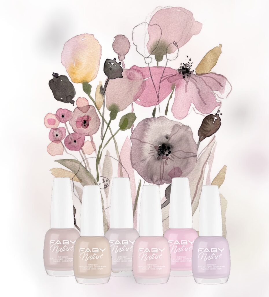 Faby propone una nuova edizione Nature dal nome Aria. Dolci nuance, declinate sui toni del beige, rosa, glicine, lilla e bianco dalla finitura semitrasparente per dare vita a toni romantici senza tempo, un inno all’Aria, preziosa fonte di vita che, nella sua trasparenza, permette di respirarla e viverla. Smalti dal cuore green che evocano atmosfere suggestive, come Brisa Calida, una calda brezza estiva, Fleurs de Glace, come un tocco d’acqua fresca, Fairy Rings, omaggio alle fate del deserto, Pavido Sussuro, sui toni del lilla, Light Kiss, la perfezione del rosa e Veil on the Skin, come un velo di seta.