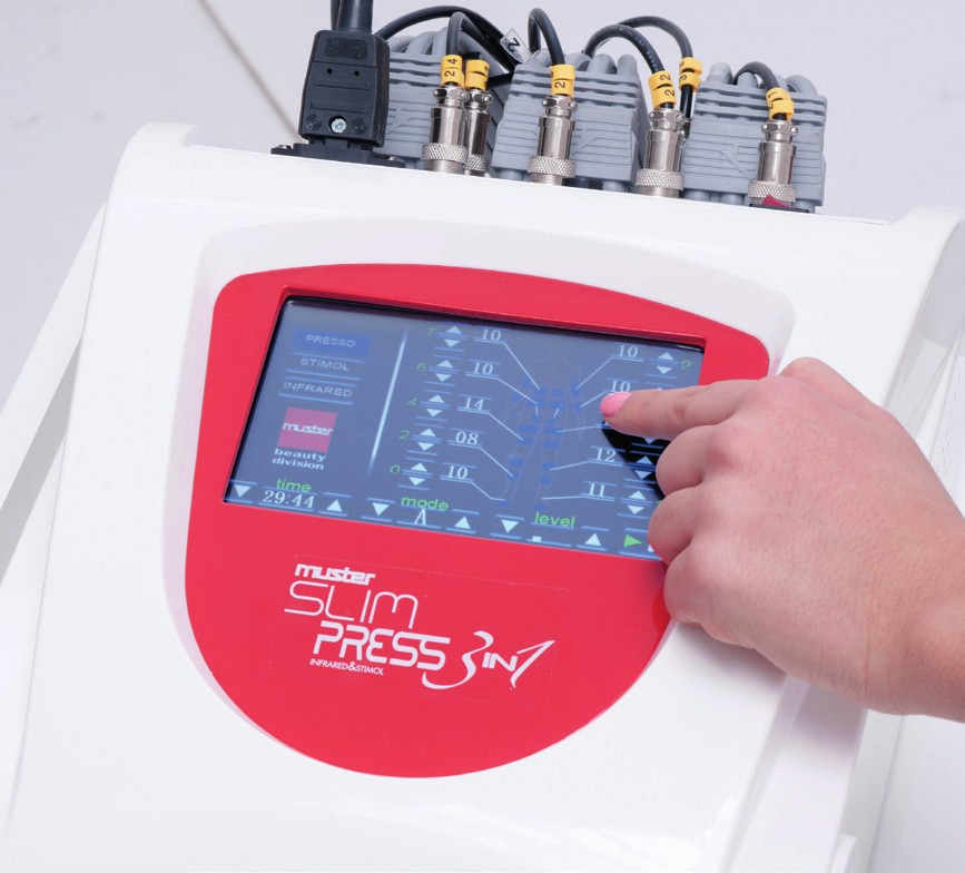 SlimPress 3in1 di Müster & Dikson è un’’apparecchiatura professionale multifunzione per trattamenti di Pressomassaggio Sequenziale, Termo Trattamento ed Elettrostimolazione. È l’azione combinata delle tre diverse metodologie che permettono di amplificare e massimizzare i risultati che si otterrebbero applicando i singoli trattamenti. Pressomassaggio sequenziale, termotrattamento a infrarosso ed elettrostimolazione rassodante e tonificante sono trattamenti conosciuti nell’ambito estetico professionale, sia per metodologia che per gli effetti positivi e visibili dei risultati che garantiscono. L’azione sinergica delle tre metodologie eseguita simultaneamente, migliore la qualità, intensificando l’azione dei singoli trattamenti, riducendo drasticamente i tempi di seduta, con un grande risparmio di tempo Questa tecnologia ha anche il vantaggio di essere compatta e silenziosa ed è dotata di ampio display touch screen a colori. Inoltre, i comandi sono intuitivi ed ha una estrema semplicità di utilizzo per ogni funzione. I tre trattamenti possono essere utilizzati singolarmente, in coppia o tutti e tre contemporaneamente.