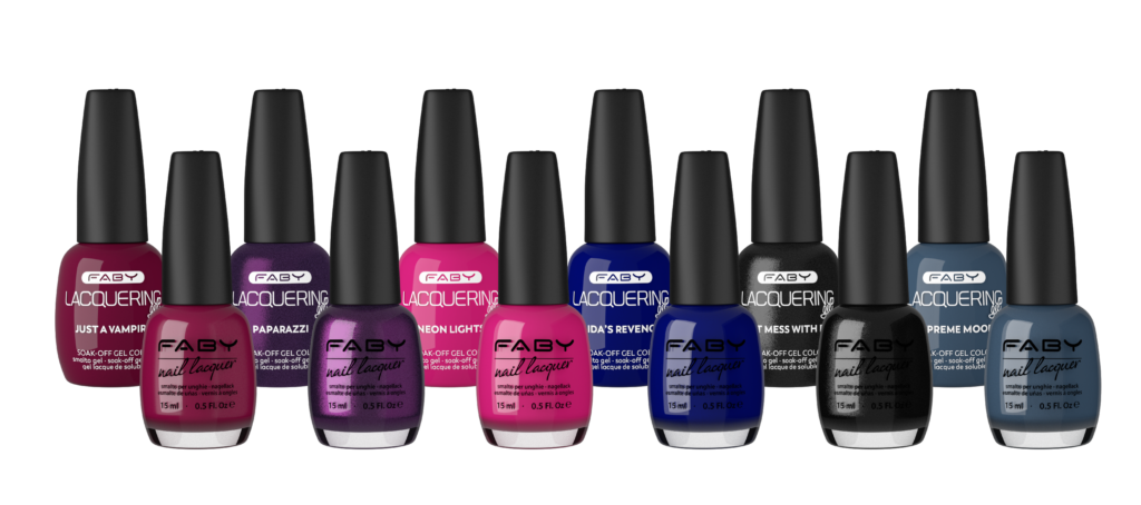 Per la nuova collezione autunno-inverno 2023-24, Faby Midnight si esprime con una palette audace dalle sei tonalità in formula Nail Lacquer e Lacquering Gel.